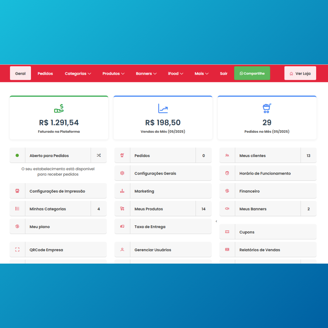 Tenha uma visão estratégica sobre seus clientes. Com esta ferramenta, você pode acompanhar o total de clientes e visualizar o histórico de pedidos de cada um. Use essas informações para entender o comportamento de compra do seu público, criar promoções personalizadas e fortalecer o relacionamento com seus clientes mais fiéis.